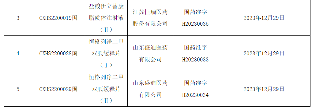 1月5日,国家药监局官网显示,恒瑞医药两款创新药盐酸伊立替康脂质体注射液和恒格列净二甲双胍缓释片均获批上市。其中,盐酸伊立替康脂质体适用于联合5-FU/LV二线治疗经吉西他滨治疗失败后局部晚期或转移性胰腺癌患者;恒格列净二甲双胍缓释片适用于适合接受脯氨酸恒格列净和盐酸二甲双胍治疗的2型糖尿病成人患者,以改善此类患者的血糖控制。